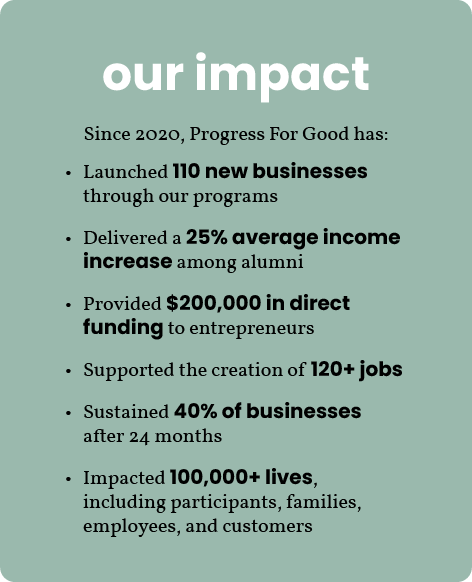 Progress for Good equips entrepreneurs from historically under-resourced communities to design the businesses, lives, and neighborhoods they love — providing the support, networks, resources, and skills to build sustainable enterprises that create generational wealth and uplift entire communities.