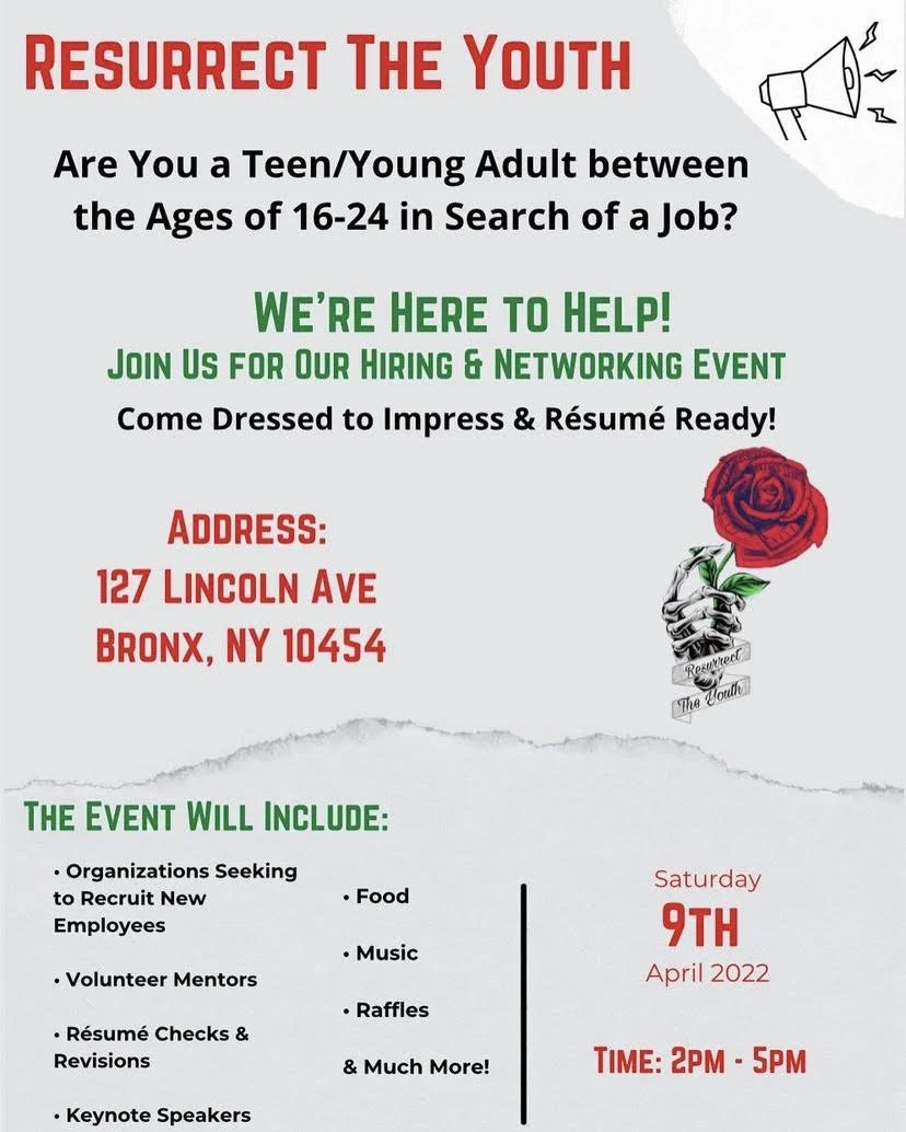 We would like to thank the Bronx Community Justice Center, Progress Playbook and our fearless facilitators, Stephany Reyes and James Reddick for supporting and guiding us through the process of launching Resurrect the Youth to end youth unemployment in the Bronx and throughout NYC.